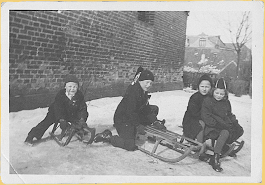 | Die kleine Rita rutscht im Schnee auf dem Kirchplatz. Den Schlitten haben wir heute noch! Im Hintergrund ist noch Göttrup zu sehen. | |||||
