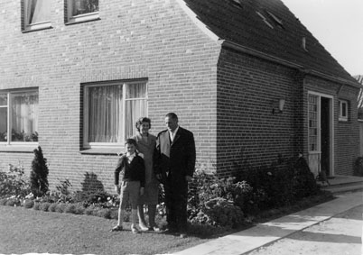 1963 ...kam als Folge dieser Hochzeit dann, in Aurich die erste Polizistentochter an, im Juni kam dort die Ina auf die Welt, da wurden der Enkel schon dreie gezählt! Im November des Jahres hat sich dann ganz Updorf gefreut: Oma und Opa ziehen ein, mit Eltern, mit Ralfi und mit einem Lloyd. Doch bevor da das kleine schnuck´lige Häuschen erst stand, musste Opa auffüllen das tiefliegende Land. Hundert Lastwagen voll Erde haben die Leut´ ihm gebracht, mit der Karre hat er geschoben, oft bis tief in die Nacht, ein Riesenstück Arbeit, aber er hat´s immer geschafft, das ist auch kein Wunder, in den Armen hat er Kraft! Und hätt´Oma ihm gesagt, ohne Berg sei Updorf nackt, jede Wette, für die Oma hätt´ er auch das noch gepackt! |