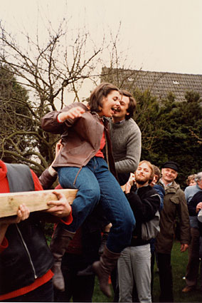 1977 ...kann man endlich wieder von Zuwachs reden, die Biggi tritt ein in das Updorfer Leben, holt den Ralfi zurück auf den Boden der Gefühle, Bewerbungen, die schrieb der ja schon viele, doch haben wollt´ ihn keiner, so einen nicht, der nachts in der Disco auf seinen Schlaf verzicht, so einen stellen wir doch nicht ein, das muß schon etwas Solideres sein. Doch bei Biggi, da war er richtig gelandet, oder war sie bei ihm nur kräftig gestrandet? Aber auf jeden Fall, und das ist sehr wichtig, war sie für sein Leben ganz einfach goldrichtig! |