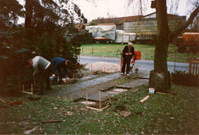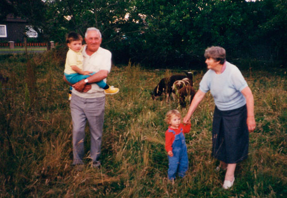 1984 ...dann, Oma lag g´rad im Bett mit ´ner Grippe, da kamen doch zwei mit ´ner ganz großen Bitte, das war die Biggi, hochschwanger, mit Ralfi im Bunde, die kamen nach Updorf, zu ganz später Stunde. Sie hätten gern da, wo sprießt sonst das Spargelkraut, am liebsten hätten sie da ein kleines Häuschen gebaut. Da mussten Oma und Opa ihre Kinder zwar erst fragen, doch taten ganz schnell alle "Ja“! dann dazu sagen! Und diesen Entschlu ß, das sagt ruhig hier vor all´ diesen Leut´, auch diesen Entschluß habt ihr wohl nie bereut! |