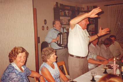 1975 ...war der Opa auch schon eben über sechzig, feiern und singen tat er immer noch kräftig, war´s Kranz einhängen, bei einer Puppvisit, bei ´ne Silberhochzeit oder was es sonst noch gibt, jeder im Dorf kann sich noch erinnern, die Oma tat es immer so sehr bekümmern, sie hatte nur Angst um Opas Leben, dabei tat er doch nur sein Bestes geben, aber Oma quakte immer wie eine Ente: „August, o August, denk an Deine Rente!“ |